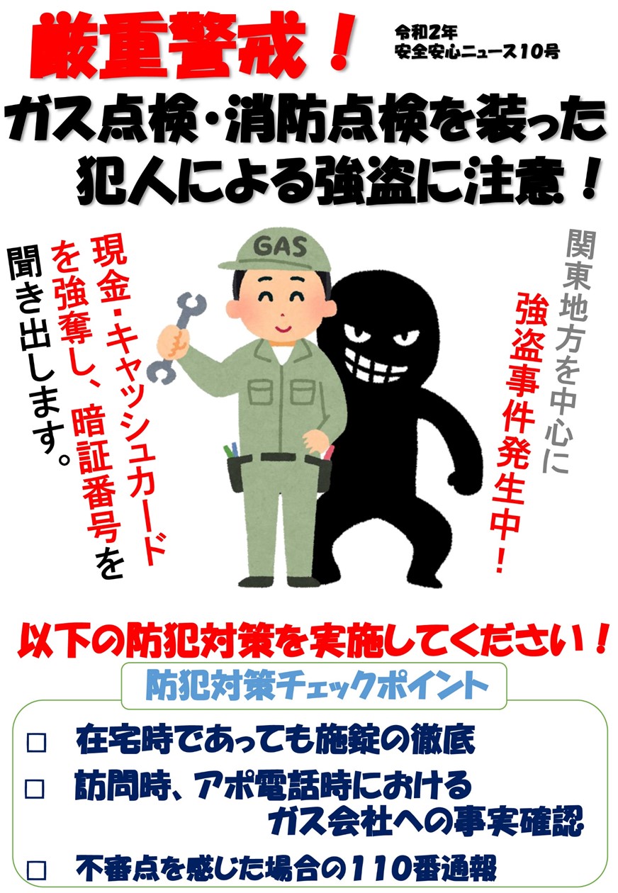 当県での発生はありませんが、関東地方を中心にガス点検等を装った強盗事件が発生しています。(東京・千葉・神奈川で発生)