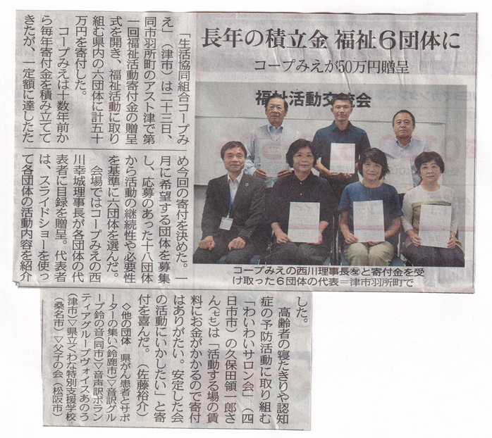 令和元年6月23日(日)、コープみえ福祉活動寄付金贈呈式と交流会が津市で開催されました。