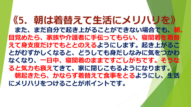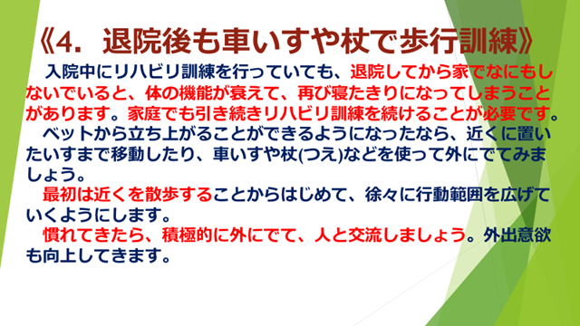 今日はシリーズ3回目、「退院後も車いすや杖で歩行訓練」と「朝は着替えて生活にメリハリを」についてでした。