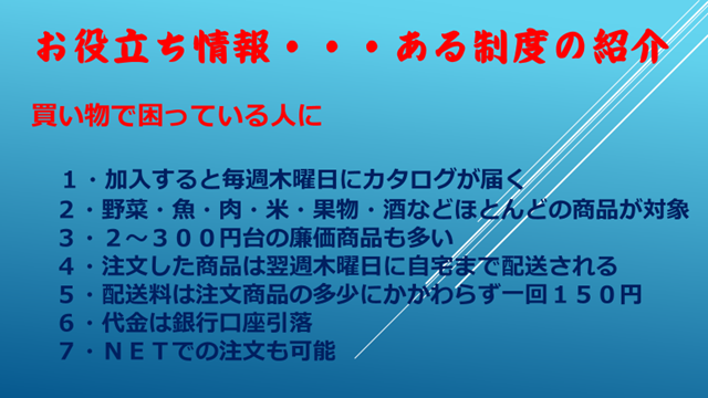 買い物に出かける必要もなく、買い物で不自由されている方や、一人暮らしの方に便利な制度です。
