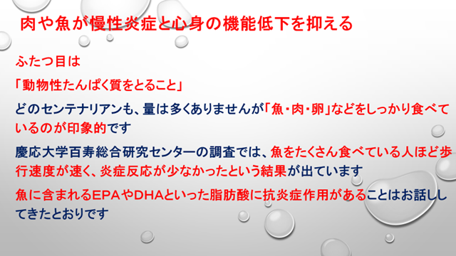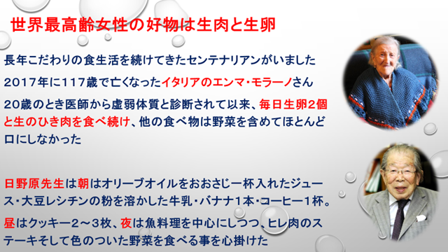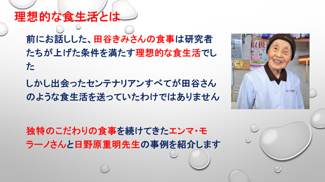 理想的な健康食に徹した田谷きみさん、独特のこだわりの食事を続けてきたエンマ・モラーノさんと日野原重明先生の事例は興味深く聴くことができました。