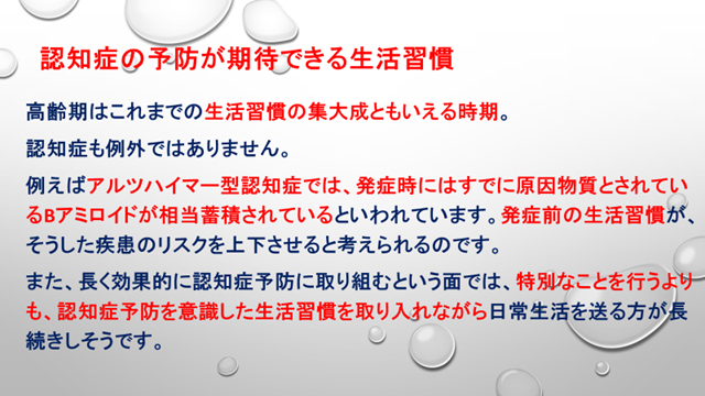 今日のテーマは「認知症の予防が期待できる生活習慣」についてです。