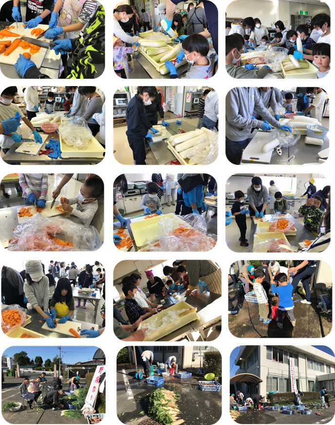 次はセンターで、収穫した野菜の仕分け、調理室で八郷汁のための調理と、八郷米のおにぎり大試食会のためのおにぎり作りです。
