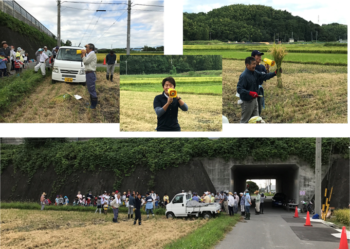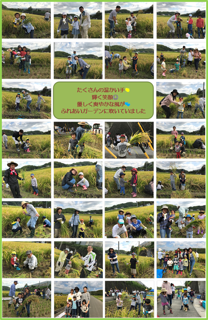 応募で申し込んでいただきいつも来てくださる親子・八郷中央幼稚園の親子・先生方・八郷福寿会・あかつき寿会・四日市大学エネルギー環境教育研究会・地区市民センター・八郷まちづくり委員会と、たくさんの方々に集まっていただけて、楽しい稲刈り日となりました。