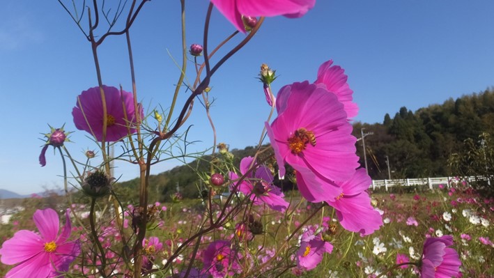平成30年10月17日に撮影された写真で、青空に良く映えるコスモスです。