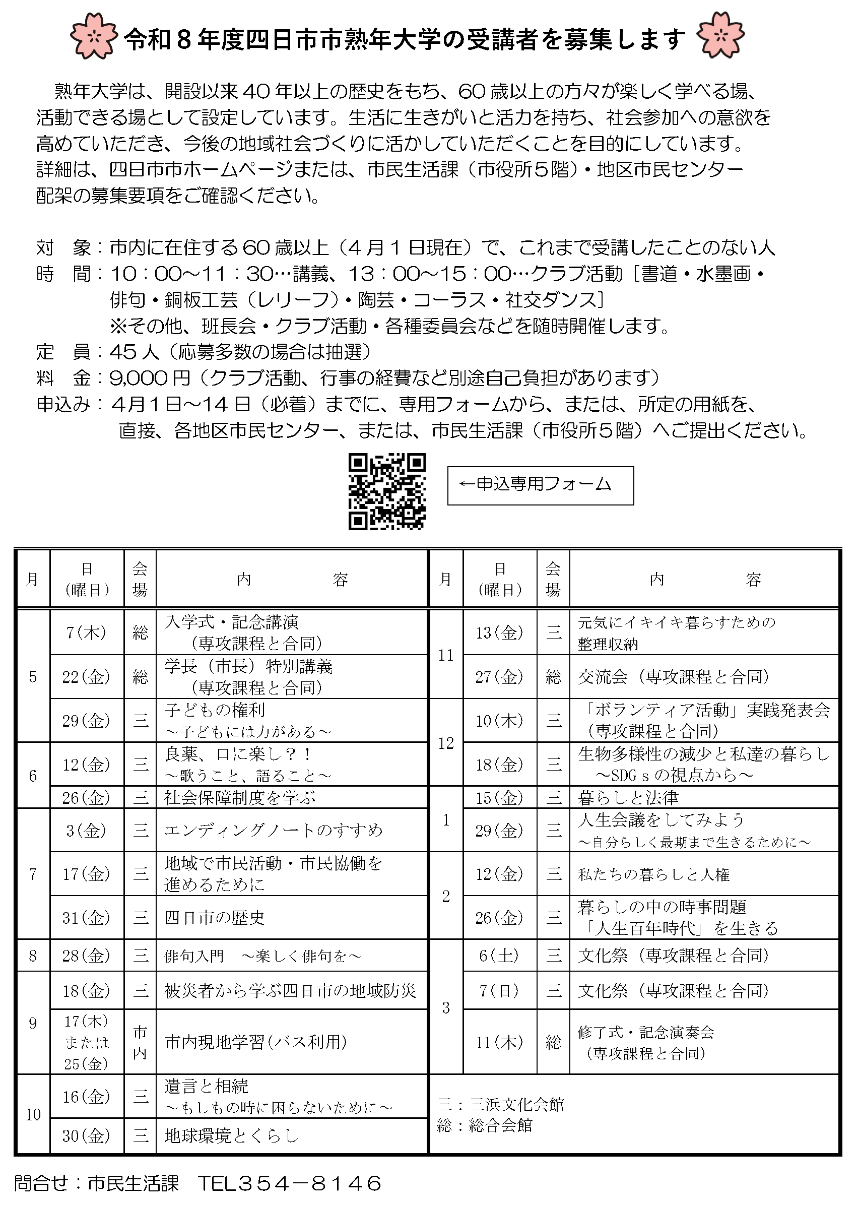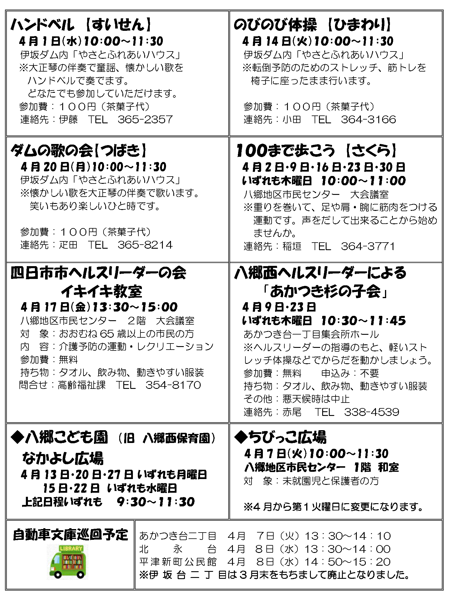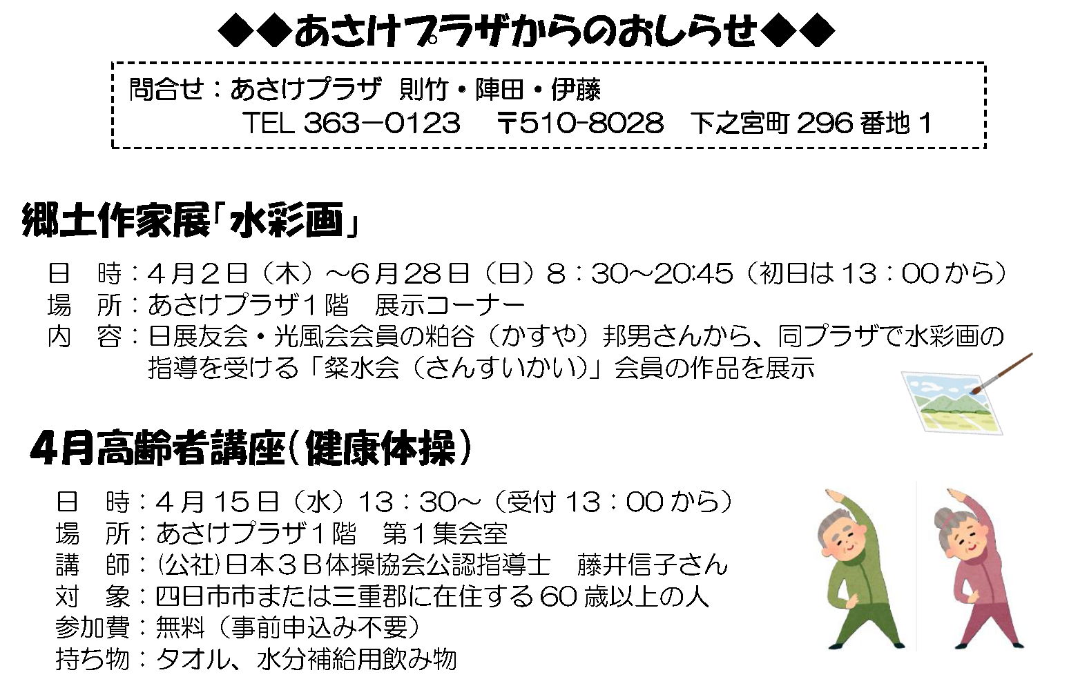 主催 : 四日市市ヘルスリーダーの会 対象:おおむね65歳以上の市民の方 ※イスに座ってのストレッチや筋力トレーニングでからだを動かしましょう。 ※マスクの着用や水分補給をお願いします。 参加費 : 無料 持ち物 :マスク、 タオル、飲み物 動きやすく、体温調節しやすい服装でお越しください。