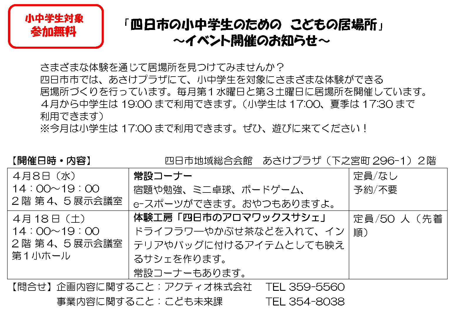 「四日市の小中学生のためのこどもの居場所」~イベント開催のお知らせ~