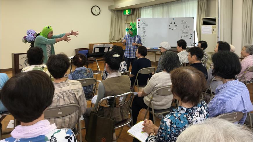 「かえるのうた」を、アマガエルやガマガエルになって歌ったり、輪唱したり。途中、笑いのプロの方にもお手伝いしていただきました。「かわいい」の声に、調子に乗ってしまうカエルでした。