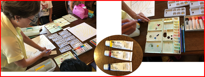 虹の会さんたちは、「赤」「青」「黄」の三原色だけで色を作り、絵を完成させていきます。