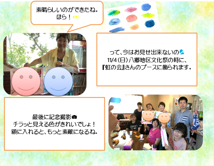 『虹の会』さんの感想です。「感性が違うみんなの力が集まると、決して一人ではできない、こんな素敵なものができました。3色の絵の具から作った色なのに、すご~い!」一同、「楽しかった!!」
