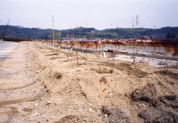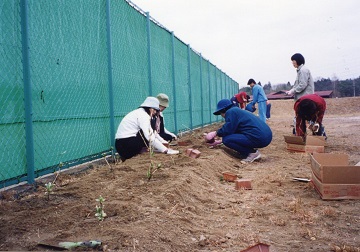 「テニスコート横ガードレール沿い」に決定すると早速「開墾」が行われました。とても硬い土地でお箸より思いものを持った事のない?! か弱い女性たちも「つるはし」等を持って耕しました。