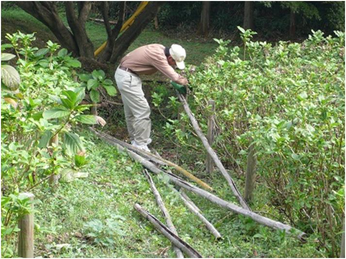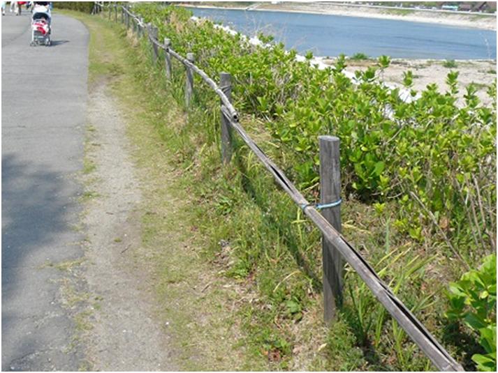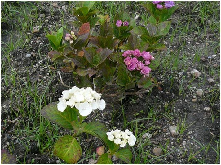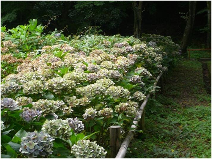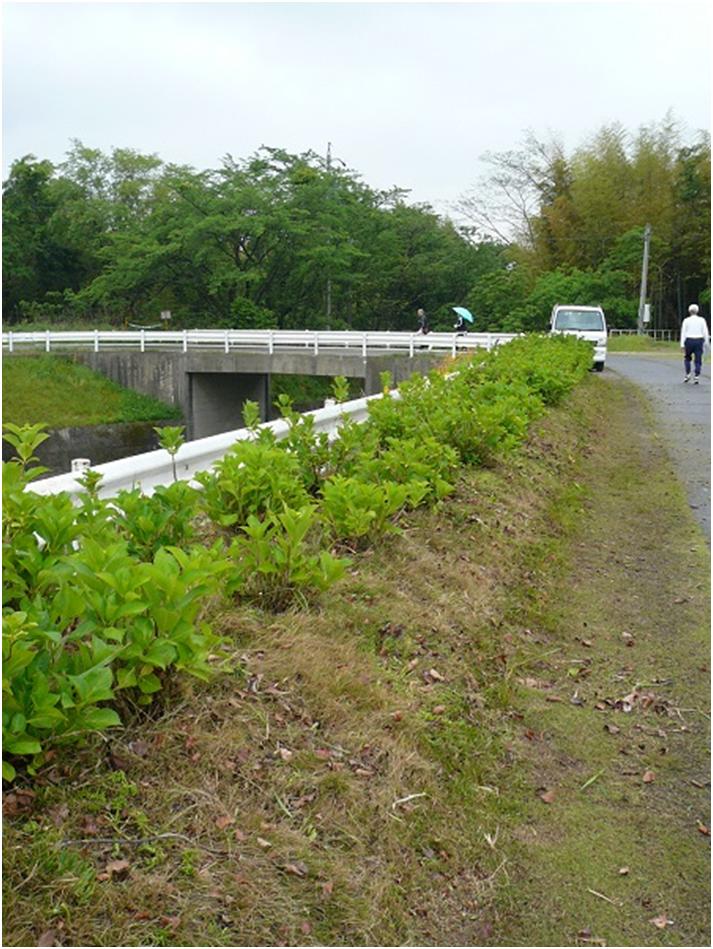 H21年には「テニスコート横ガードレール沿い」では、それまであった柵が取り払われました。木が古くなったのとアジサイも生えそろって来たので外しました。