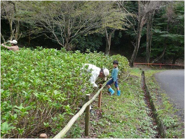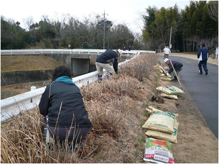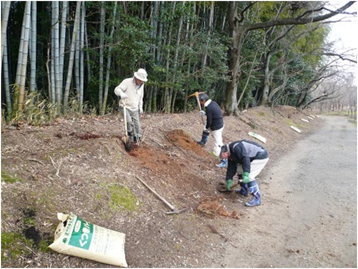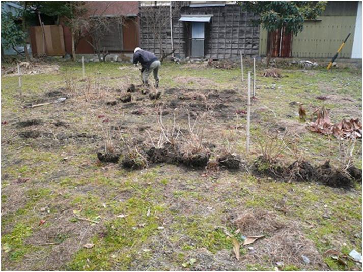 「テニスコート横ガードレール沿い」に10本と「アジサイプロムナード」に40本。穴を掘り、堆肥を入れて定植しました。