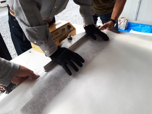 昨年度の不織布が残っていましたので、それを約2mにカット。それだけでは、心もとないので今年届いた不織布の新しい巻きを50匹分ほどカットしました。後は、こいのぼりの「くち」に当たる部分をエクセル線が通る幅に溶着しました。
