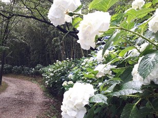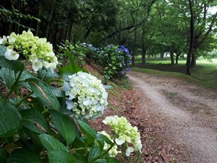 なかでもアジサイプロムナード(サイクル広場奥)は、周囲の木立と土の道と