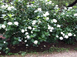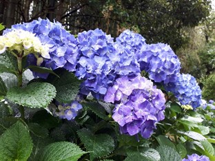 生垣と生垣の間に一株、いや一束だけ紫陽花が元気に咲いている場所があるのですが、少し離れた所にある紫陽花群とは、品種の差かもしれませんが勢いが違うようにみえます。去年もそうでした。生垣の影響(造園業者の定期的な管理のおこぼれ?)かな~ あるいはこの株にはファンのような人がついていて手厚く世話をしているとか? あるいは生垣の地下には給水装置のようなものが仕込んであるとか?
