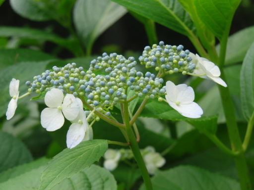 | 登り口ため池横にひっそりと・・・ | 登り口ため池横に咲くガクアジサイ |