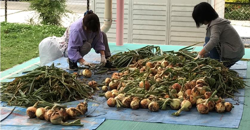 5/31、ホールの中までいい匂い。園児が収穫した玉ねぎだぁ!