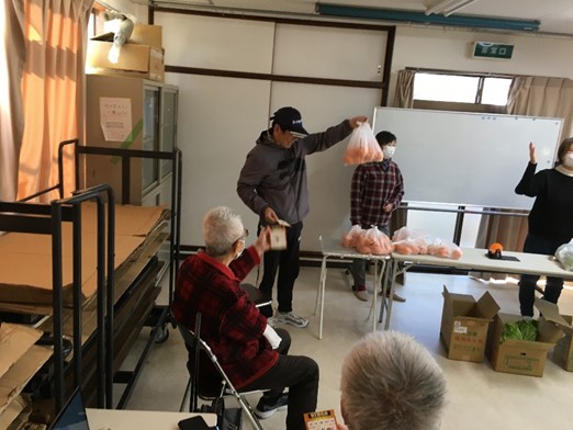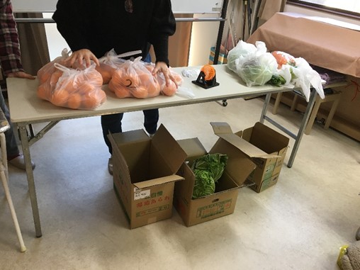 久保田会長から、ビンゴ大会用景品として。ミカンや野菜をたくさん寄贈戴きました。