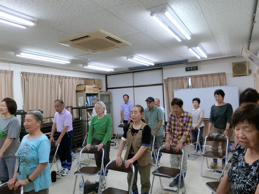 四日市市北地域包括センターの土田講師から注意事項の説明があり、そのあと土田講師の指導で体操を実施しました。