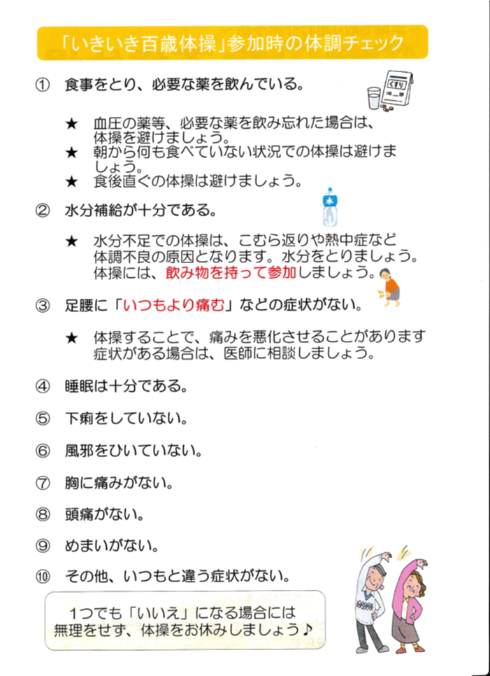 いきいき百歳体操の注意事項は次の通りです。