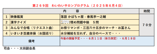 久しぶりの晴天、快適なサロン日和となりました。 本日のわいわいサロンのプログラムは次の通りです。