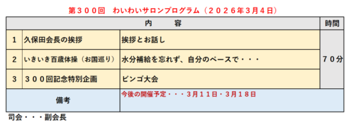 5・次回わいわいサロン開催のご案内 次回開催日 2026年3月11日(水) 10時00分~11時30分 スタッフの皆さま、300回に渡りボランティアでわいわいサロンを支えて戴き本当に有難うございました。以上
