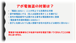 いくら電話で身内や家族を名乗られても応えず、電話を切って警察や家族・わいわいサロン仲間に相談しましょう。