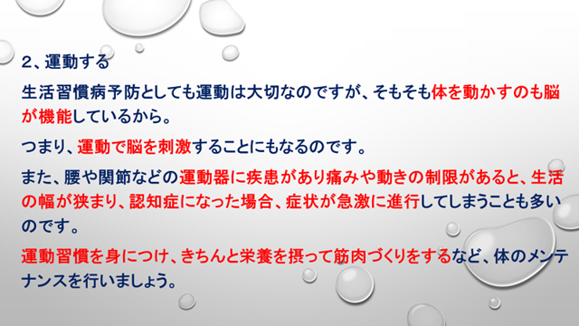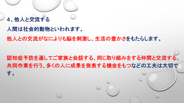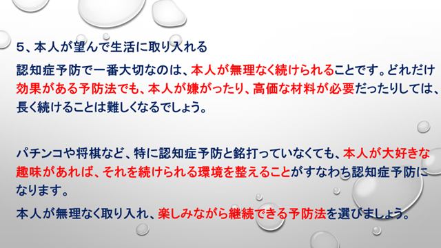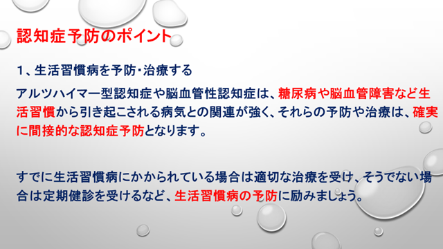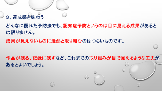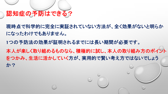 今日のテーマは「認知症予防のポイント」、本人が楽しく取り組めるものなら積極的に試し、本人の取り組み方のポイントを、生活に活かしていく事が必要とのことです。