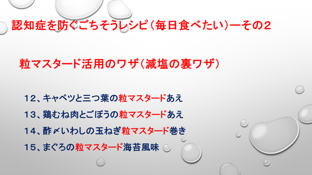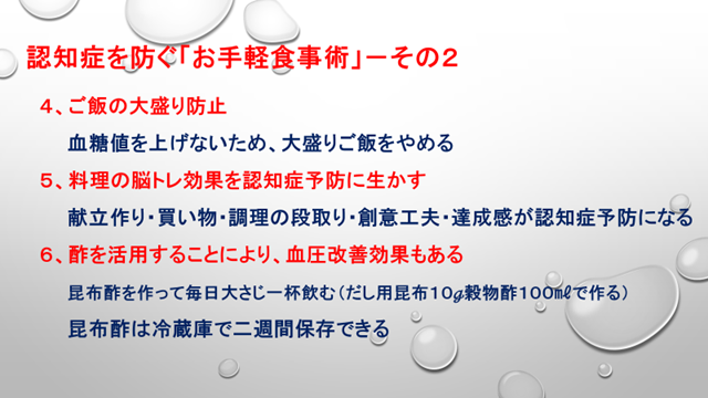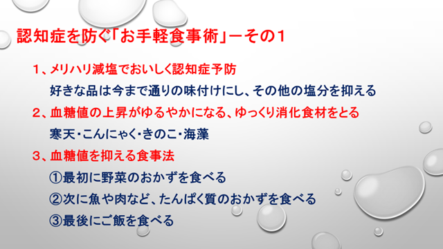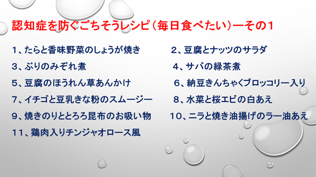 今日のテーマは、認知症を防ぐ「お手軽食事術」と、認知症を防ぐごちそうレシピ(毎日食べたい)についてお話がありました。