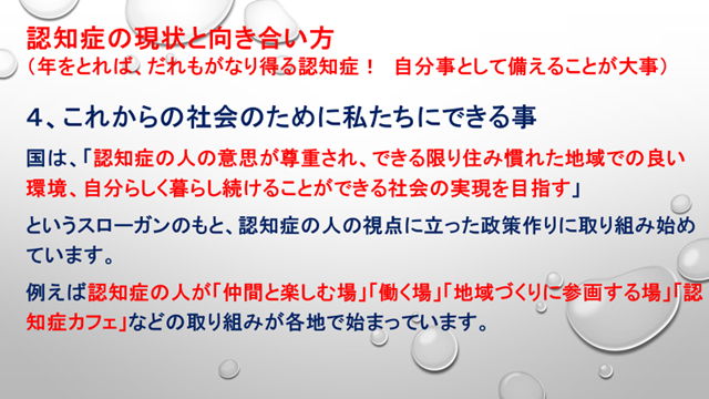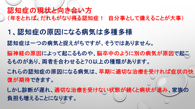 開会の挨拶に引き続きシリーズ(認知症を防ぐ「脳」若返り科学ワザ)の4回目のお話しがありました。