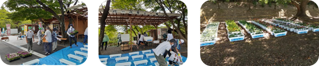 平成16年度からの取り組みです。密を避け鉢植えは屋外で、毎年好評いただいている、スクリーンを使用した余興と茶話会は中止しましたが、その代わりにメッセージ入りのお菓子をお配りし、くじ引きを行いました。