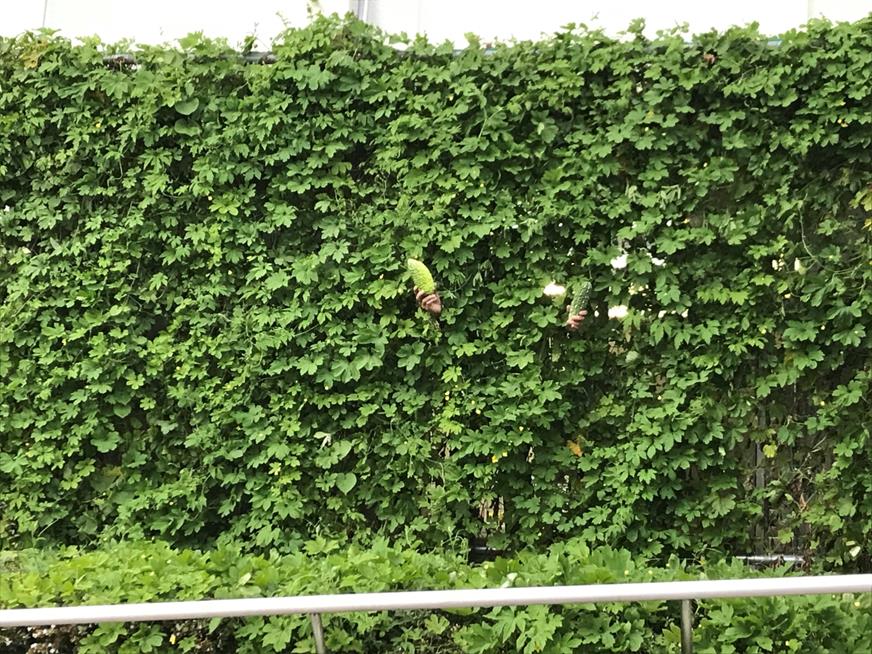 さて、ここで「マネージャーをさがせ!」(10/3)のコーナーです。グリーンカーテンの中に・・・