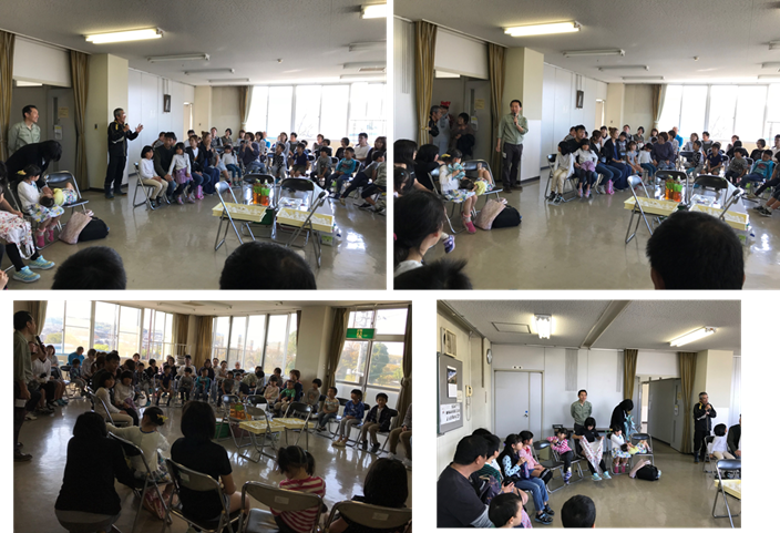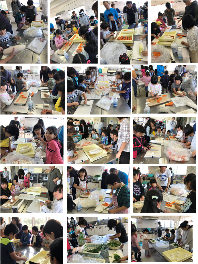 センター調理室に移動して、八郷汁の調理です。毎年参加してくださっている方々も何人かみえるので、親子で慣れたもんですね!包丁で切るのも順番に、大会議室の椅子並べやおにぎり握りなど、スムーズにお手伝いしてくれてありがとう。
