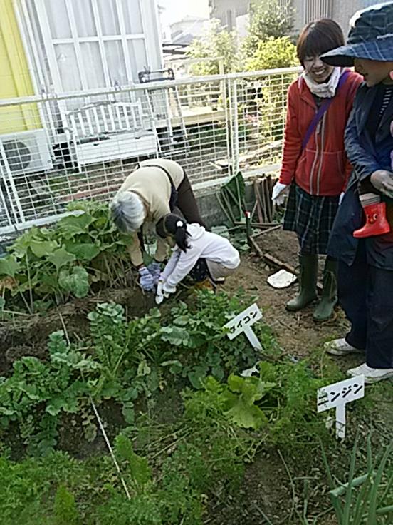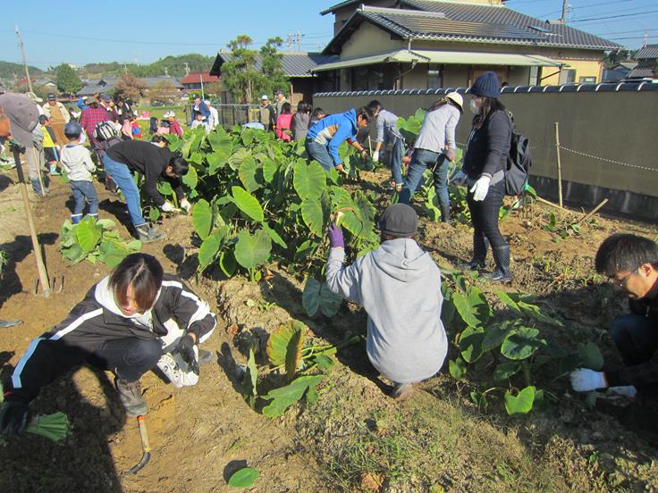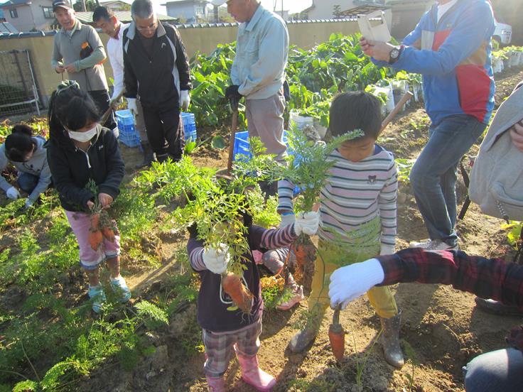 ☀先ず、「あかつき台ふれあいガーデン」と「伊坂町ふれあいガーデン」で同時に「人参」「ねぎ」「ゴボウ」を収穫し、その後、あかつき台の参加者に伊坂町に移動していただき、一緒に「里芋」「さつま芋」の収穫を行いました。