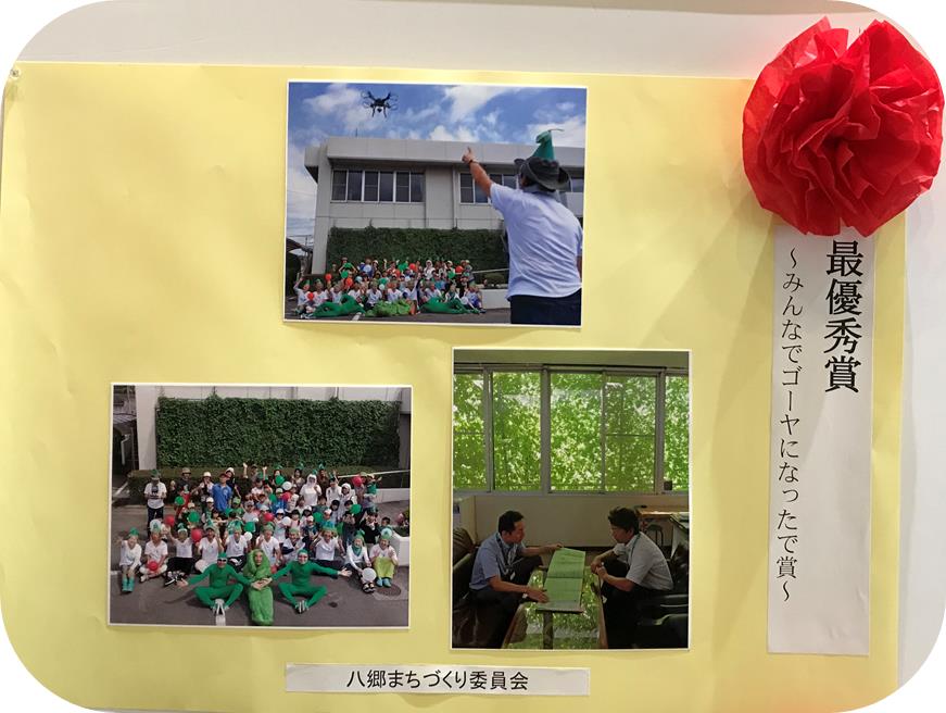 当日、残念ながら全員は揃いませんでしたが、委員のIさん手作り「八郷まちづくり委員会」のTシャツを着て、「いつも笑顔で楽しむ」私たちらしく授賞式に臨みました。