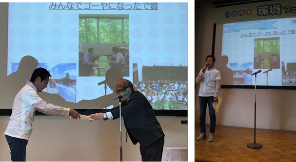 代表で賞状を受け取ったのは、地域マネージャーSさん。受賞コメントでは、ゴーヤの植え方や水やり・肥料のやり方などの工夫、作る喜びなどのお話をしていただきました。