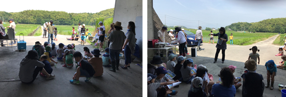 何の生きものかわからない時や、珍しい生き物を見つけた時は、四日市大学エネルギー環境教育研究会の先生方に、見ていただきました。そして、休憩の後は、先生方に自然や生きもの、環境についてのお話を聴かせていただきました。