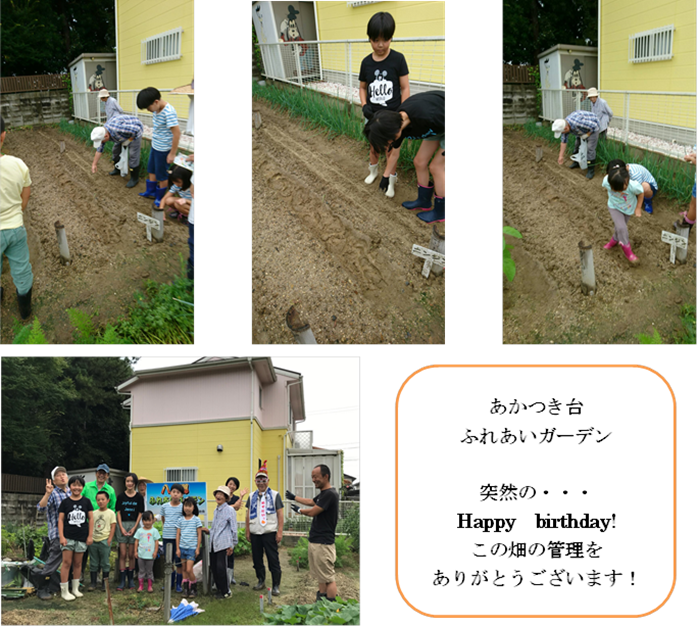 7月20日(土)、「あかつき台ふれあいガーデン」と「中村町ふれあいガーデン」にそれぞれ集合!にんじんとゴボウの種まきのお手伝いをしました。雨続きでお天気を心配しましたが、雨も降らず曇り!絶好の作業日和になりました。作業の後は地区市民センターに移動して、お楽しみの「かき氷」を食べました。今日もたくさんの笑顔のふれあい、ありがとうございました。また、あかつき寿会・福寿会の方々もお手伝いをしていただき、どうもありがとうございました。
