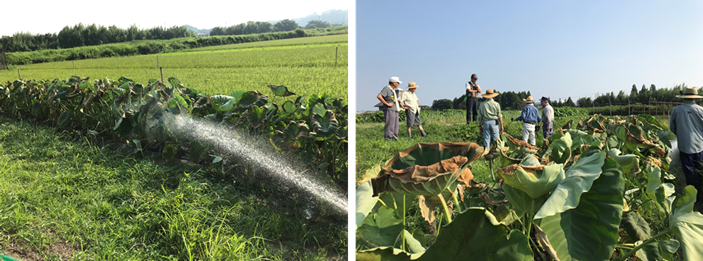 8/2正午過ぎに、まっちくりグループLINEがピロン!!「連日の酷暑で里芋がグロッキーです。お助けを!!」と。自宅から、出先から、仕事場から午後4時に集結。水中ポンプで散水をしました。駆けつけられなかったメンバーからも、「里芋ちゃんの無事を祈ります。」などの言葉が。がんばれ!野菜たち。ちゃんと見守っていきますね。