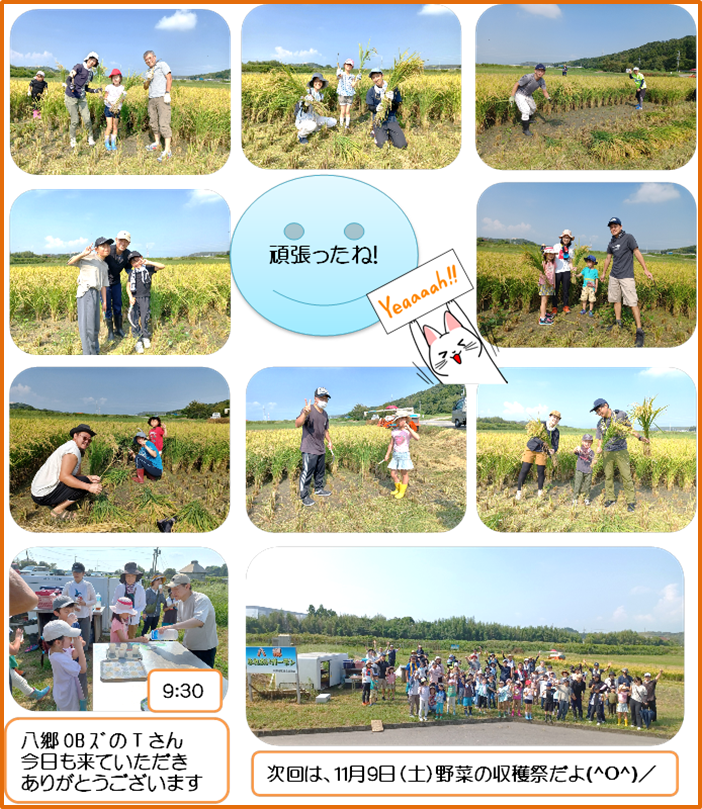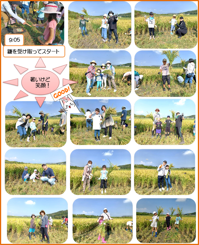 9月8日(日)『ふれあいガーデン』にて稲刈りのお手伝いを行いました。残暑厳しい中での手刈りで、みんな汗びっしょり💦熱中症対策として、手刈りは途中で終わらせ、残りは機械で刈りました。