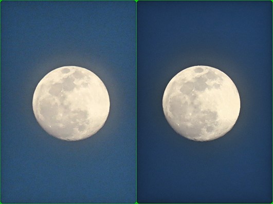 プレスーパームーン(2月18日、日入1分後の17:38と:40、町内にて撮影)