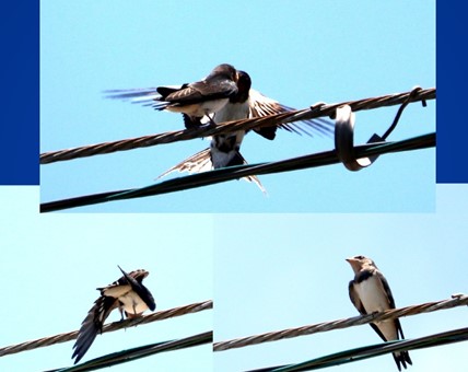 下、ワイヤ上で給餌を待つ巣立ち雛。丘の麓にて6/9正午ごろ撮影。)