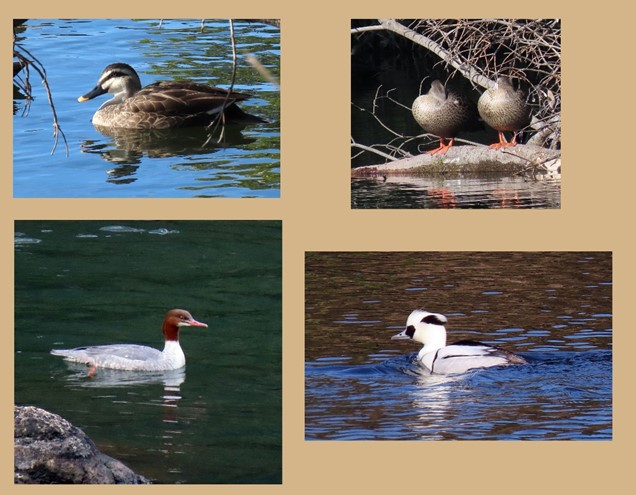カワアイサは、南山城村の木津川にて1月18日、他の水鳥は大安町