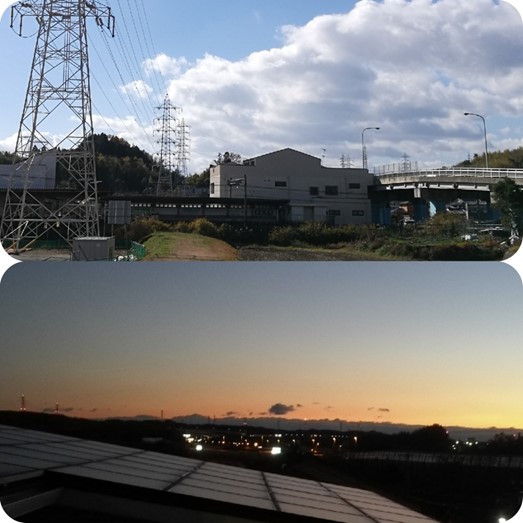 高圧線は伊坂丘陵地、朝明川、三岐鉄道を越えて工事中の鉄塔に繋がる 上、あかつき学園前駅方面、下は伊坂丘陵地を望む、中央付近の灯火は東名阪道 左端に向けて鉄塔の航空障害灯が続く |