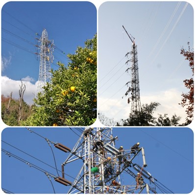 上は工事中の鉄塔に繋がる西と東の鉄塔、下は、西側の塔で作業中のチーム |