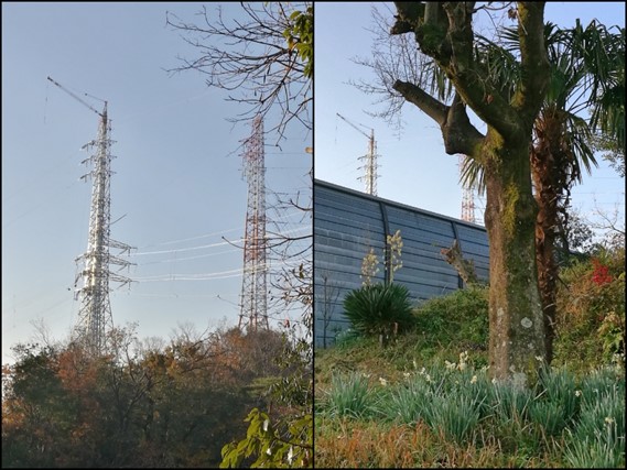右、散歩中、ユッカの花の上に鉄塔を見かける。寄り道して左の塔を撮影。 |