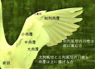 低速で飛び立つため、次列と三列の風切羽に大、中、小の雨覆羽