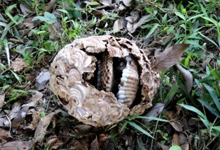 スズメバチの巣(刈取り草原の端、林縁のツツジの垣根で営巣)