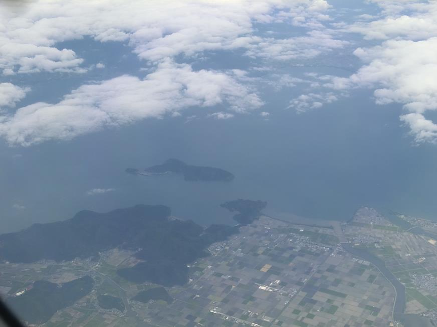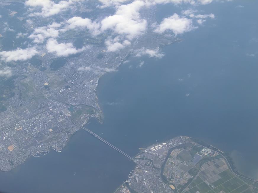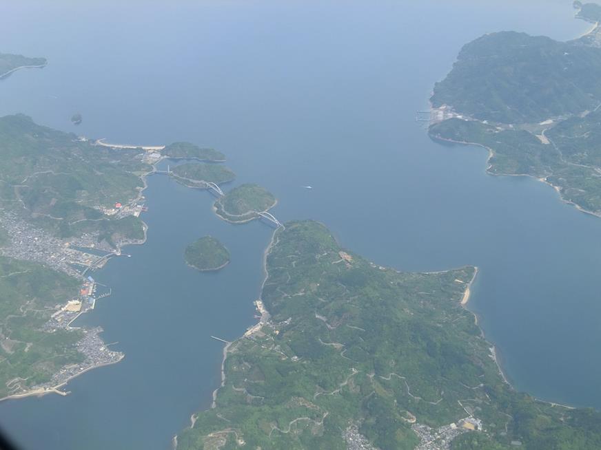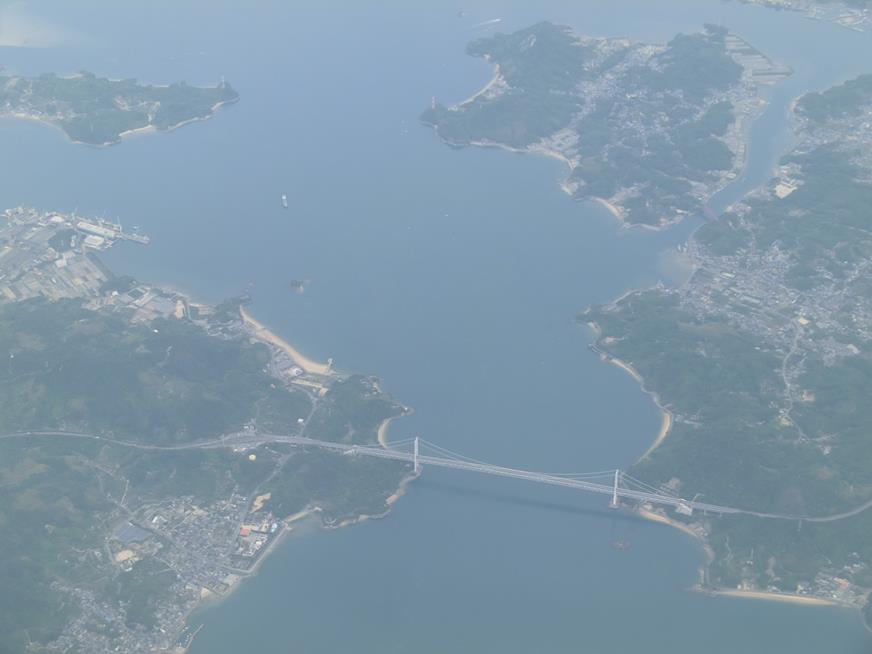同じく瀬戸内海上空で着陸態勢に入りました 見えているのは岡村島と大崎下島を結ぶ橋と思われます